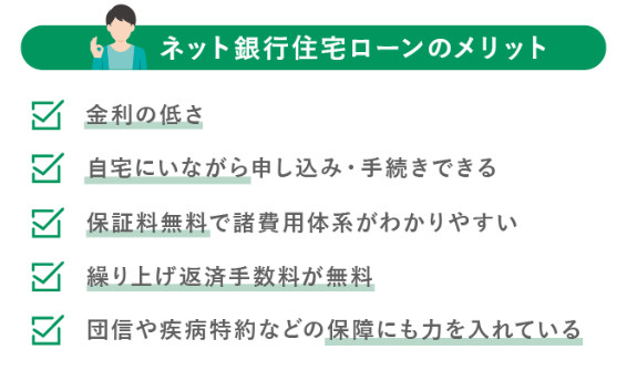 まず住宅ローンをネット銀行で組むメリットとしては金利や手数料が普通の金融機関よりも低い点が挙げられます。なぜならば、ネット銀行は実際の店舗を持っていない分、運営費や維持費が安く済み、その分金利を安くできるのです。さらに保証会社を利用していないので、保証料は発生しません。そのうえ、こまめに繰り上げ返済ができるのも特徴です。一部のネット銀行には繰り上げ手数料が無料なところもあります。